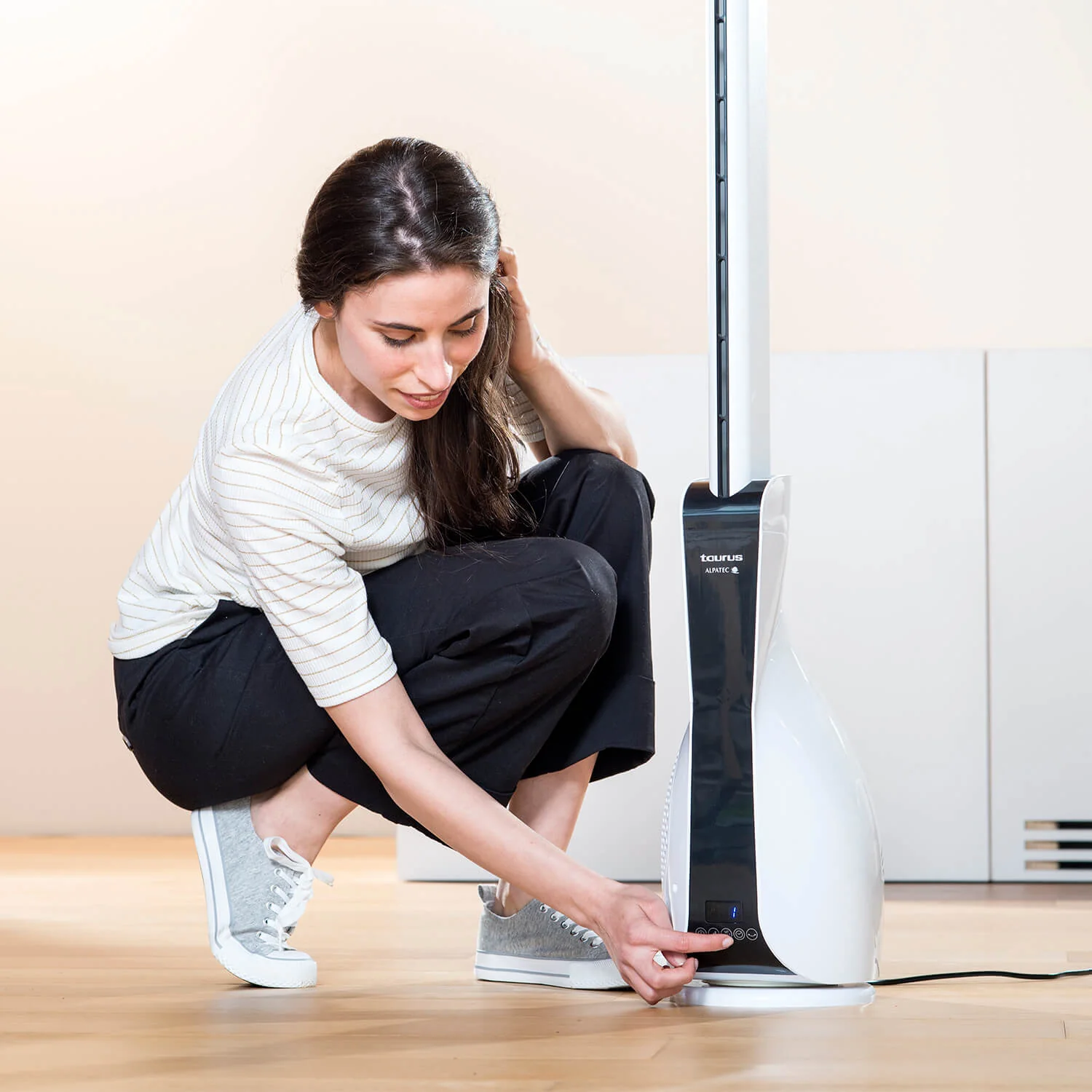 El ventilador de torre Babel Invisible de Taurus combina tecnología sin aspas y motor DC de cobre para una ventilación segura, silenciosa y eficiente. Cuenta con 12 velocidades, 3 modos, temporizador de 12h, pantalla digital con indicador de temperatura y selector táctil. Su filtro anti-polvo es extraíble y lavable. Incluye mando a distancia con doble alojamiento: magnético delantero y trasero. Con 101 cm de altura, es ideal para hogares modernos que buscan diseño y confort.